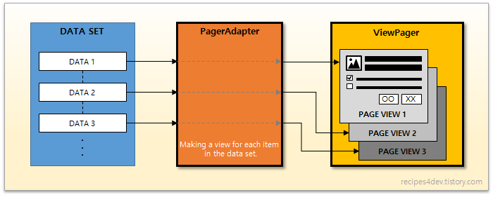 즉, 각 페이지를 뷰로 구성하고 싶으면 RecyclerView.Adapter를 직접 상속하면 되며