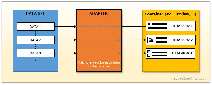 위 그림을 통해 어댑터(Adapter)의 역할을 쉽게 파악할 수 있을 것이다.